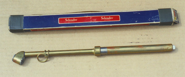 GAGE (8-G-615): The tool is 12 ½ inches long and is made of brass naturally finished. It is stamped Schrader / REG U.S. PAT. OFF. / MANUFACTURED BY / A SCHRADER'S SON / DIVISION OF SCOVILL MFG. CO. INC. / BROOKLYN, N.Y. U.S.A. / PAT. NOS. 1,716,399 1,742,740 / 1,866,140 1,838,166 1,894,648 / US PROPERTY / ORDNANCE DEPT. This tool is packed in a A. Schrader's Son 's box labeled "…ONE 7188B T Service Tire Gauge". This box was packed loose in the box. |