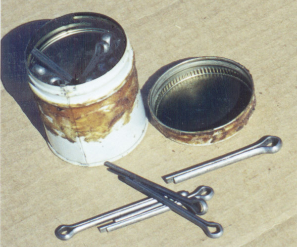 PIN, Cotter: This assortment is in a small white tin can with a screw type lid. The can is 2 inches high and 1 ¾ inches diameter. The top has been sealed with wax?