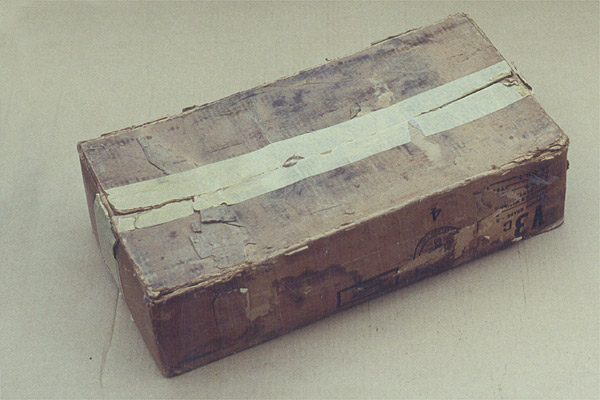 THE BOX: The box is a cardboard box. It is 10 3/8 inches wide, 20 inches long, and 5 3/8 inches deep. The top has been sealed with 3 inches wide tan masking tape. There are no signs of glue or staples holding the top. The markings on the box are printed on with black ink. Once the US Army had taken possession of the vehicle, the contents of this box would have been stowed in their proper positions. With no further need to retain this box, it would have been disposed of. We can only speculate that the MB Mr. Frederick was luckily able to purchase in 1946 was indeed a brand new jeep. The factory supplied compliment of tools and spare parts remained unopened, still in the original box. Because Mr. Frederick did not discard this box in 1946, we have a real "Time Capsule" to investigate in 1999. |