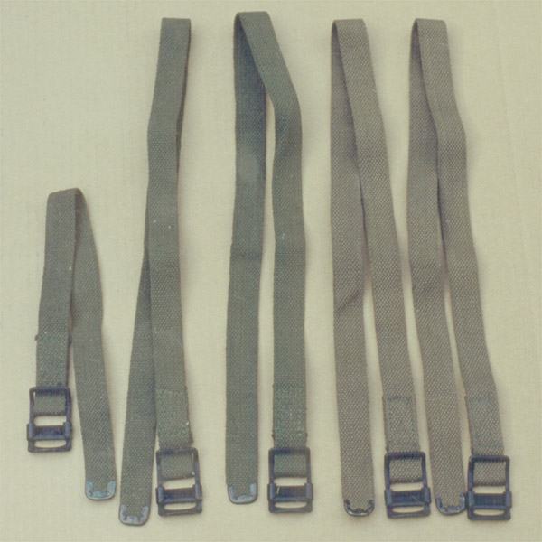 STRAPS: These items are packed in a brown paper bag 3 5/8 inches x 6 inches x 10 ½ inches. The bag has the letters "SWS" over a shield trademark with "6" and "TIGER" in the shield. "A UNION BAG" is below the shield. No other markings are found on the bag. Inside the bag a packed 5 straps or belts with buckles. Four of the straps are 37 inches long, one strap is 20 ½ inches long. All straps are 1 inch wide. I can see how 2 of these straps could have been for holding the top under the passenger seat. I do not know what the other 3 would have been for. |