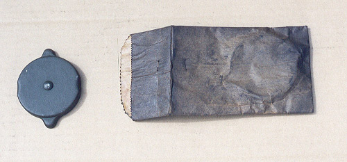 SUMP, REAR DRAIN HOLE COVER: This item is packed in a oil paper bag 4 inches x 8 ½ inches folded over and stapled with one staple. This cap was kept in the glove box unless fording a stream. |