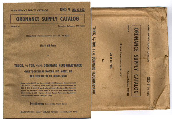 ORD 9 SNL G-503, ORDNANCE SUPPLY CATALOG, GROUP G Technical Reference TM 9-803, (See scan for complete title), HEADQUARTERS, ARMY SERVICE FORCES, 15 FEBRURY 1945. It is packed in a brown manila envelope, 9 ½ inches wide and 12 ½ inches long. The envelope is similarly titled. |