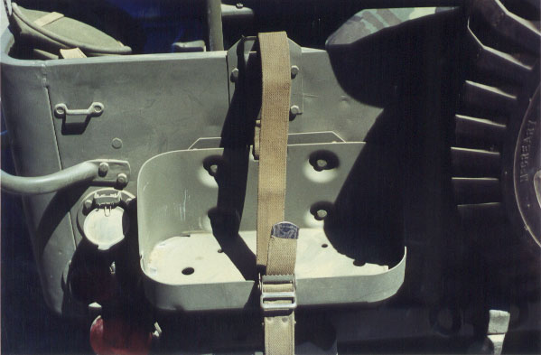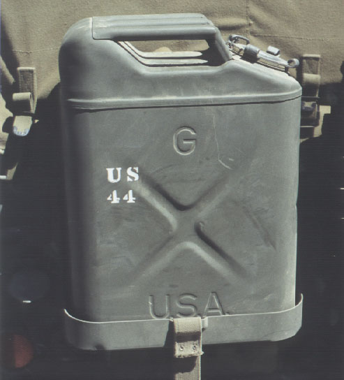 The jeep did not come from the factory with a gas can. This was added by the unit to which the jeep was assigned. This means that the jeep received a gas can from stores (military storage). Any gas can with a WWII date could be proper for the Jeep. As all gas cans are dated, it is easy to determine which can is proper. Gas was the normal liquid carried. Depending upon mission requirements, or other in field needs, water cans, soups cans, and lubricating oil cans could be substituted. |
