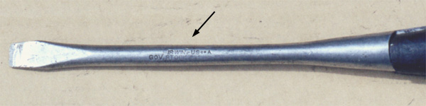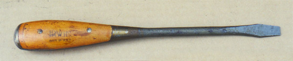 Willys kit: The screwdriver is 11 ¼ inches long. The metal part is unpainted and natural metal finish. The wood handle is finished with a yellow shellac, stamped on black paint reads IRWIN / MADE IN U.S.A.