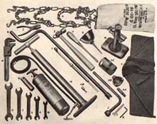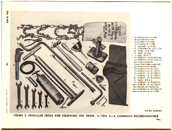 Notes: Items called "Common Tools" in ORD 7 are called "Vehicular Common Tools" in ORD 8. TM 9-803 calls some of the items "Vehicle Tools" while some others are called "Vehicle Equipment". TM 9-803 does not list a screwdriver as part of the tool kit. ORD 8 lists the fire extinguisher as "Vehicular Equipment and Accessories". In this section, according to ORD 7, we learn that the ax and shovel are added by the using troops. This can help explain the wide variety of types used. A "Crescent Wrench, 8 inch" was listed in earlier dated documents. It is listed here for completeness. * Ord 7 lists the wrong lug wrench! Instead of listing 41-W-3837-55 with a hex opening of 49/64, it lists Number 41-W-3837-25 which is a "Double end, hex and square opening of 1 33/64 hex & 0.817 sq. that is 11 13/16" long! The lug wrench must also serve as the jack handle, a double end wrench would not work! |